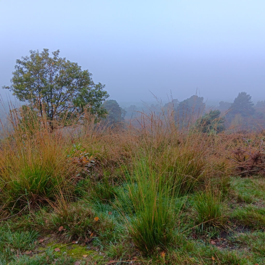 Ik prijs me gelukkig dat ik aan de voet van Nationaal Park de Sallandse Heuvelrug woon, dus binnen no time sta ik midden in het bos. Tijdens de wandeling word ik als vanzelf uit mijn gedachten gehaald en naar mijn zintuigen geleid. Mijn ogen registreren de sporen van een ree dat niet heel lang geleden voorbij is gekomen. Ze zien de verschrikkelijk mooi plaatjes die de herfstige natuur op dit moment biedt: kleurige bomen, mistige doorkijkjes en allerlei soorten paddenstoelen die op het moment als paddenstoelen uit de grond schieten (😉). Mijn oren horen het onophoudelijk vallen van de mistdruppels. Ze horen de ganzen die massaal aan hun trektocht zijn begonnen (ik hoor ze al een paar dagen). Verwonderd sta ik stil bij hoe vreemd het eigenlijk is dat ik ze overduidelijk hoor overvliegen, maar ze niet zie door de mist en bewolking. En ik heb genoten van het feit dat ik hier op dit moment blijkbaar de enige mens ben.